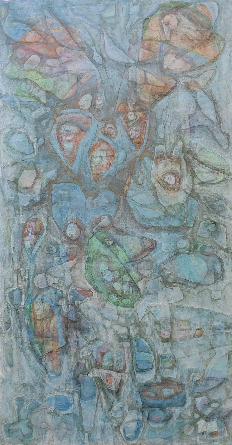 “Doughnuts for Cats”, Gouache + Latex on canvas, 24” x 48”, 2023.